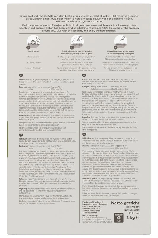 Door je gazon te voeden krijg je een sterk en gezond gazon. De PokonGazonmest met Kalk 3-in-1 is zeer geschikt voor elk gazon, het hele jaar door. Deze hoogwaardige gazonmeststof op basis van organisch minerale grondstoffen bevat een uitgebalanceerde mix van essentiële voedingsstoffen. Uniek is de toegevoegde kalk in de korrel. In plaats van apart kalk en voeding te strooien ben je met deze gecombineerde korrel dus in 1 keer klaar. Met extra magnesium en ijzer waardoor je gazon bovendien een mooie volle groene kleur krijgt. Door het hoge kaliumgehalte wordt je gazon sterker, heb je minder last van mos en krijgt het gras meer weerstand tegen vorst in de winter. Deze gazonmest is ook zeer geschikt als bemesting nadat je graszoden hebt gelegd.